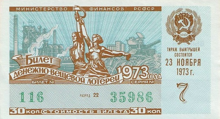 5428000 денежных и вещевых выигрышей получат обладатели счастливых билетов седьмого выпуска денежно-вещевой лотереи РСФСР 1973 года. Тираж состоится 23-24 ноября в Ульяновске.
