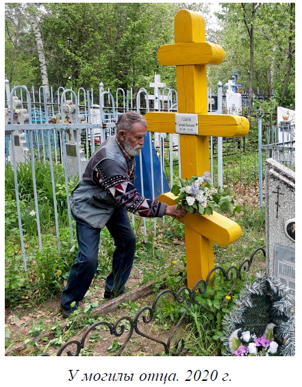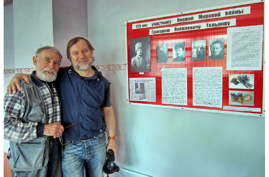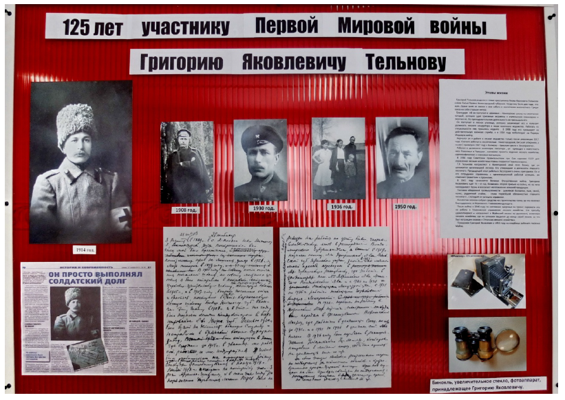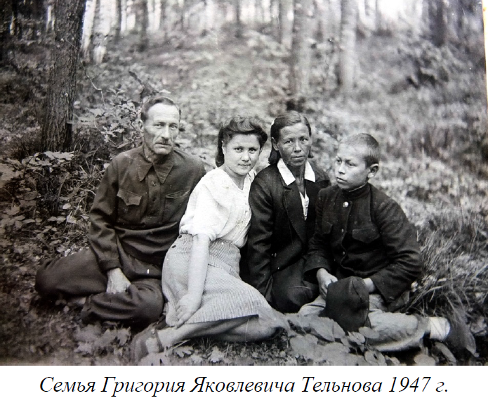 В 1951-м году скончался отец, его похоронили на Майнском кладбище. Могила и сейчас ухожена, там стоит дубовый крест, помог который поставить лесничий Николай Балмашнов. Отрадно, что моего отца, инженера лесного хозяйства Григория Яковлевича Тельнова помнят в Майнском районе – в год столетия Первой мировой войны, участником которой он был, в местном музее экспонировался стенд о нем. В Отечественной войне Тельнову, как старшему лесничему Вохомского лесхоза Костромской области, не пришлось участвовать. Он находился на брони и поставлял продукцию своего предприятия на фронт. Всё для фронта, всё для Победы! – такой был призыв, в те годы, для всего населения страны. На стенде размещены фотографии в различные годы жизни Григория Яковлевича, в том числе в год начала 1 Мировой войны и предпоследний год (1951) его жизни. Различные публикации из газет и журналов, а так же биография, написанная им самим за год до смерти и фоторепродукции вещей, привезённых им с фронта.
