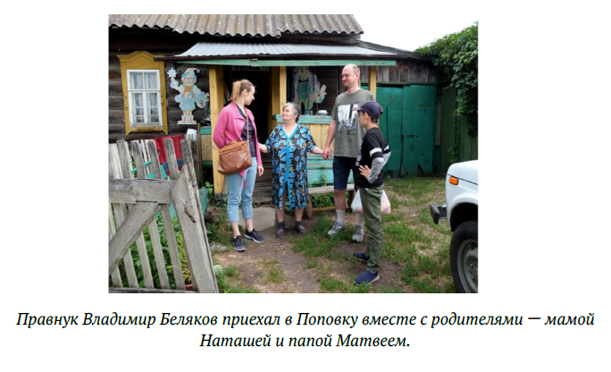Регулярно в Поповке отдыхают мой сын Григорий, его жена Наталья и внук Кирилл, живущие в Санкт-Петербурге. Правнук Владимир Беляков приехал в Поповку вместе с родителями — мамой Наташей и папой Матвеем. Из Москвы приезжают внучка Наташа с мужем Матвеем и правнуком Володей. Они, конечно, самые желанные гости, всегда радуют нас. Помогает по хозяйству в меру своего желания сын Александр, тоже пенсионер, он живет постоянно с нами. Огорчают только его вредные привычки, они ухудшают не только его здоровье, но и, в большей степени, наше. По образованию Саша художник, но, к сожалению, из-за своих пагубных пристрастий, не смог раскрыть способности, не проявил присущий ему с детства талант. Однако надежды, что он возьмется за ум и за кисти, родные всё-таки не теряют. Особенно мама, Лидия Александровна, она об этом молится каждый день.