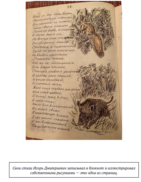 Однажды, поднимаясь по крутому склону он сказал мне: «Боря, пойдем потише. А может присядем, отдохнем?» Я не возражал, минут через десять мы пошли дальше. Игорь относился ко мне внимательно, старался помочь. Как-то раз в сумерках уже я решил позвонить в Ульяновск по мобильнику. Сигнал был слабый, пришлось подняться на полуразрушенную стену здания. Когда спускался, ушибся, поранил руку. Пришел домой в крови, Игорь тут же помог мне, перебинтовал рану и смерил давление. Свое давление он регулярно замерял и по совету врача записывал. Здоровье, конечно, было уже не то, что в молодости, но мы старались регулярно бывать на рыбалке или охоте. Чаще под наши выстрелы попадались вальдшнепы, иногда тетерева. Вернувшись в его домик, готовили ужин, потом располагались на диване, вспоминали разные истории, смотрели фотографии и видеоролики. Игорь читал экспромтом сочиненные тут же, на свежую тему, стихи.