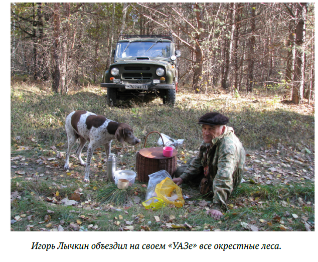 Иногда нам с Игорем приходилось менять план действий, меняя маршрут. Однажды поехали на машине с Юрием Пилепцовым в лесной массив в район трассы газопровода. Преодолев речку вброд у околицы села, мы выехали на край поля. Под колесами потрескивал первый лед, стоял конец октября. Проехав с километр, мы в сосняке спугнули пару молодых тетеревов. Мы заметили, где они сели, осторожно туда пошли — на расстоянии друг от друга метров в тридцать. Я шел в середине, впереди бежала собака Лора, обнюхивая траву и кусты. Вскоре она удалилась, а я, осторожно ступая, чтобы не шуметь, шел между сосен. Увидел вдруг застывшую в стойке Лору — дал ей команду «вперед», и я подбил своим выстрелом птицу. На выстрел подошли Игорь и Юрий, поздравили с добычей. Обратно вернулись через сосняк с большими прогалинами. На одной из них Юрий присел: «Смотрите, что я нашел!» Мы удивились — вокруг него была тьма рыжиков, почти сплошь вся поляна. Решили не охотится, а собирать дары природы. Вытащили из машины корзины, кастрюли и соль. До конца дня работы хватило — рыжики были отборные. На другой день добычу увезли в Ульяновск.
