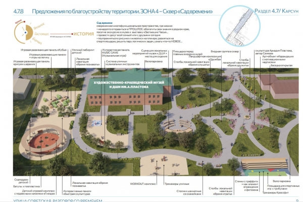 Благодаря инициативе здесь появятся: сквер «Три слободы» с ландшафтной композицией, раскрывающий историю населённого пункта XVII века. На перекрёстке улиц Куйбышева и Советская разместят объёмную композицию со светящимися буквами «Земская улица». Этот арт-объект может стать одним из знаковых мест поселка и эффектной фотозоной. На улице Земской расположат также пешеходные дорожки, велодорожки, места отдыха, стенды с информацией об историческом здании, перед зданием музея создадут «Земскую площадь». С другой стороны обустроят современное многофункциональное пространство «Сад времени», где будет возможно посетить экскурсию в музее, поупражняться в рисунке и живописи или провести занятие на спортплощадке.