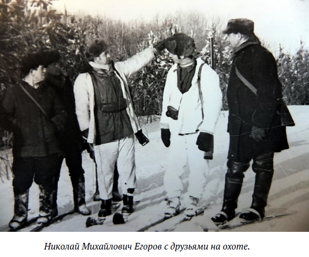 Мы вместе добывали там зайцев, компанию нам составлял знатный гончатник Петр Егорович Зимин, у него была прекрасная собака Флейта. Наслаждались в заснеженных молвинских лесах красотой природы, лаем гончих. А потом усталые возвращались с добычей в избу мамы Николая Михайловича Лукерьи Георгиевны. Хозяйка доставала из русской печи горшки с тушеной зайчатиной, ароматной и вкусной. Откушав, мы начинали охотничьи байки, Зимин читал свои стихи, а Егоров запевал любимую песню «Ноченька».