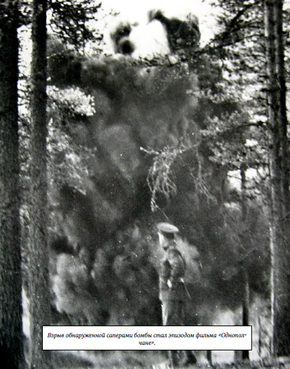 Неразорвавшиеся снаряды, бомбы и мины находят в тех лесах и сейчас. При нас, летом 1966-го года, саперы нашли стокилограммовую авиабомбу и неразорвавшийся снаряд с финскими листовками. Мы попросили взорвать бомбу для нашего фильма, договорились о точном времени взрыва — рации, чтобы согласовать действия, у нас не было. Сверили часы, приготовились, саперы отвели нам место в 250 метрах от болота, где находилась бомба. По мху, по колено в воде, мы отправились к намеченной точке. Идти было трудно, тащили штатив, камеру, аккумулятор, груз цеплялся за мелкие кусты.