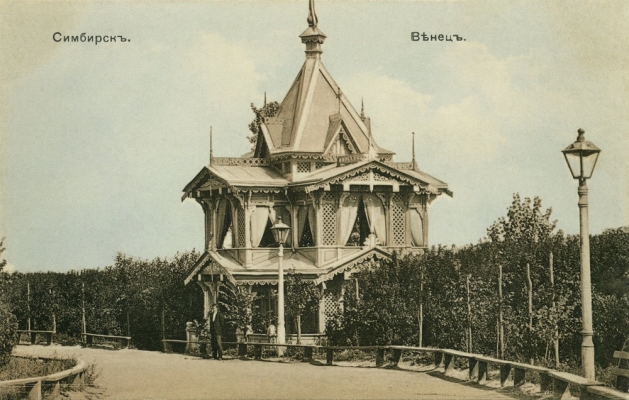 Одной из интересных деталей городской застройки конца 19-го – начала 20-го века в Симбирске была большая деревянная беседка на бульваре Новый Венец. Ее изображения сохранились на фотографиях и открытках, которые имеются в том числе в фондовом собрании Музея-заповедника «Родина В.И. Ленина». О ней писал историк-краевед Павел Мартынов, ее в своей книге упоминал ученик Горького, проживавший в Симбирске писатель Степан Скиталец.