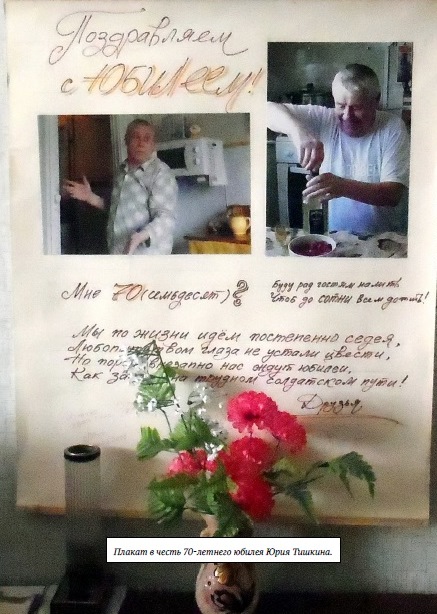 Все вместе уговорили отметить Юрия Дмитриевича семидесятилетний юбилей в кафе возле памятника Гончарову. Оно состоялось в апреле 2014-го года в центре Ульяновска. Поначалу Юрий Дмитриевич сомневался, смогут ли приехать туда его друзья из Заволжья. Но празднование удалось — все товарищи с другого берега смогли собраться, поздравили его стихами и песней. Художник Петр Никитенко подарил юбиляру свою картину, на ней нарисованы те цветы, которые любил Юрий Тишкин.