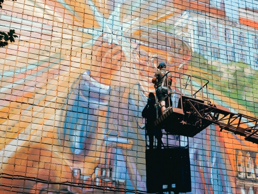 Художник Марат Петров заканчивает очередной мурал (настенное живописное полотно). В этот раз холстом послужил торец ульяновского строительного колледжа на ул. Любови Шевцовой, 57.