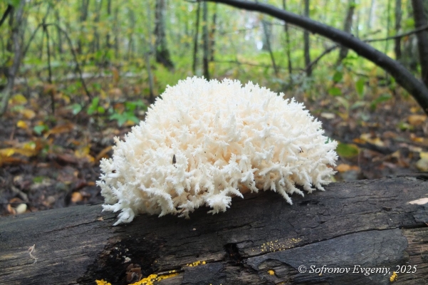 – Ежовик коралловидный. Плодовое тело гриба напоминает ветку коралла, многократно-разветвлённое, белоснежное. Растёт гриб на стволах и пнях мёртвых лиственных пород деревьев: осины, вяза, дуба, берёзы и крупных сучьях лежащих деревьев. В молодом возрасте считается съедобным, но собирать его не следует, так как это редкий вид. Включён в Красную книгу России, – рассказал фотограф.