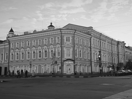 Выразительная фотография XX столетия: трёхэтажный дом на углу Большой Саратовской, ныне Гончарова, и Дворцовой, недавно вернувшей прежнее имя, улиц. В первом этаже, как полагалось в те времена, расположены офисы. Здесь находились отделение страхового общества «Россия», и магазины, табачный «Дукат», винный, купца Медведева, и ювелирный, «золотых, бриллиантовых и серебряных вещей». В окнах первого этажа – решётки, «память» о событии 27 апреля 1906 года. Тогда здание оказалось в эпицентре событий эпохи Первой русской революции, и всё, благодаря «беспокойному соседу», Симбирскому окружному суду, занимавшему второй и третий этажи в том же доме.