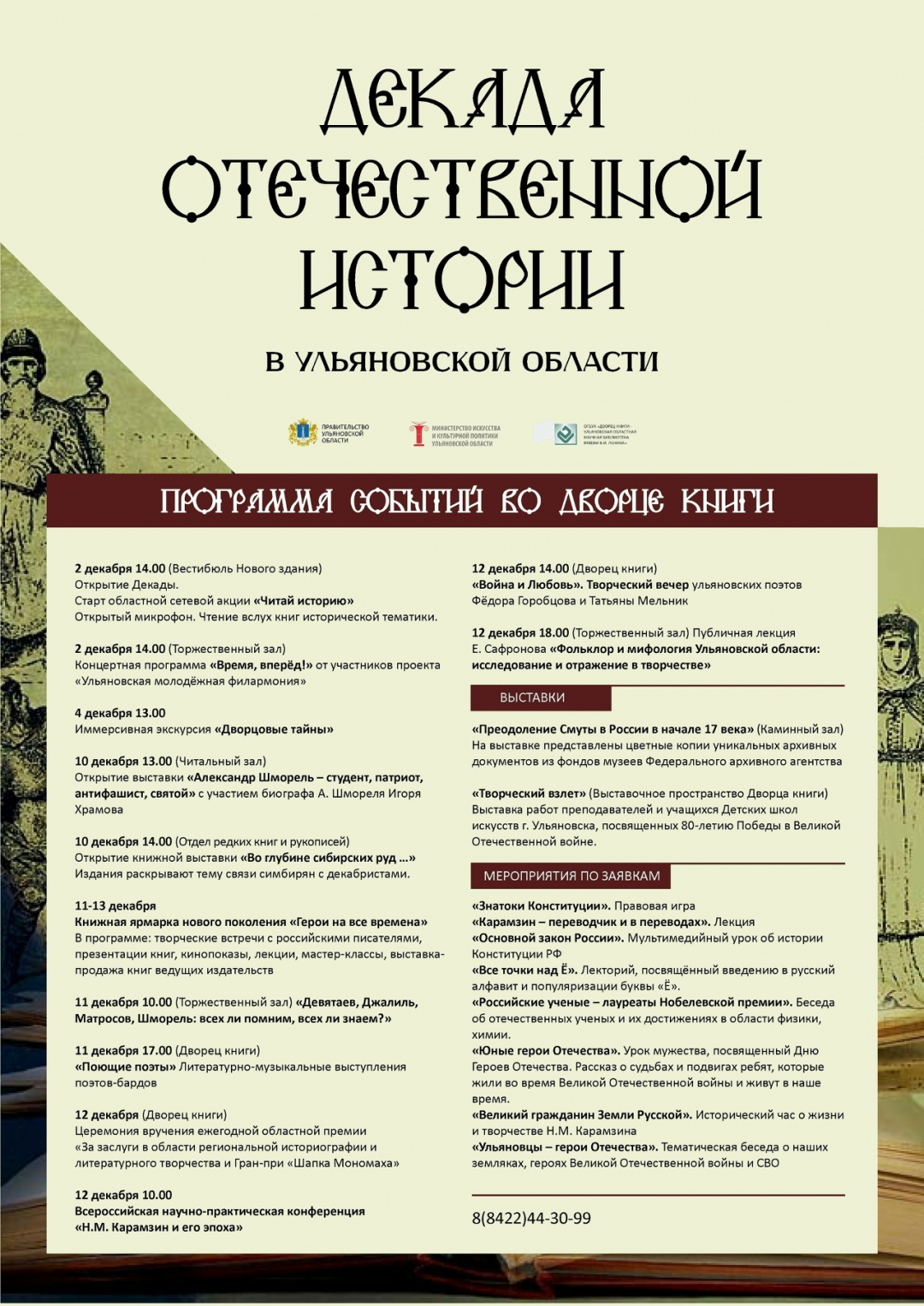 Всего в рамках Декады Отечественной истории во Дворце книги пройдёт больше 60 мероприятий, тематических бесед, краеведческих, информационных, литературных, классных часов, выставок, пройдут громкие чтения в библиотеках города и области, лекции, викторины, презентации, конкурсы, интеллектуальные игры и виртуальные экскурсии.