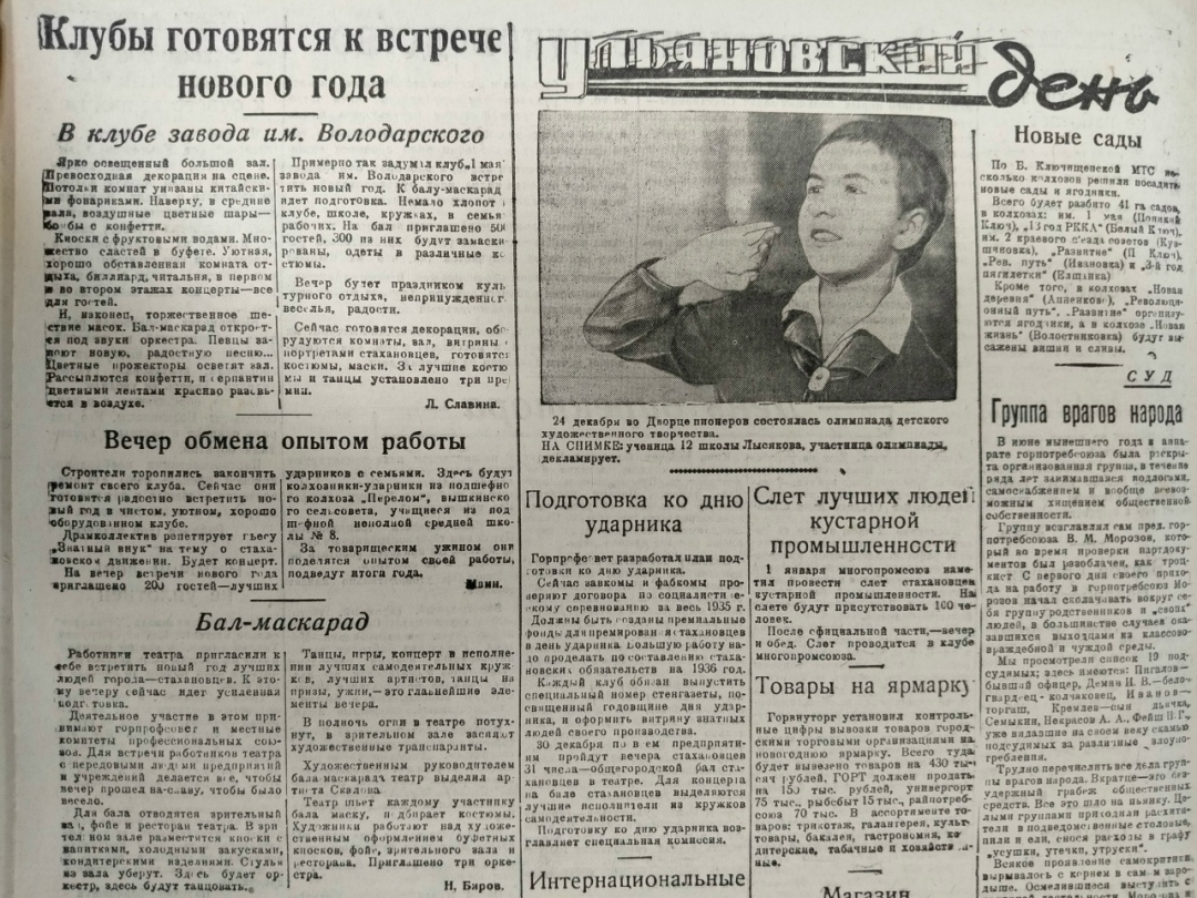 В первой под заголовком «Клубы готовятся к встрече нового года», рассказывается, как клуб завода имени Володарского воплощает в жизнь свою идею бала-маскарада. На торжество приглашено 500 человек, 300 из них будут в костюмах. Киоски с фруктовыми водами, множество сладостей в буфете, комната отдыха, читальня, на первом и втором этажах - концерты - все для гостей.