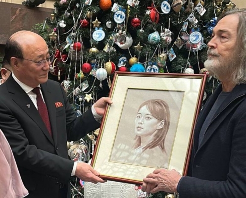 – Я решила обратиться ко всемирно известному художнику Никасу Сафронову, и он сумел за ночь написать её портрет сангиной. Фотографию выбирали вместе. Будучи не знакомыми с товарищем Ким Ё Чжон лично, мы с Никасом подумали, что на этом фото запечатлены важнейшие, на первый взгляд несовместимые качества: нежность и женственность с силой и решительностью.