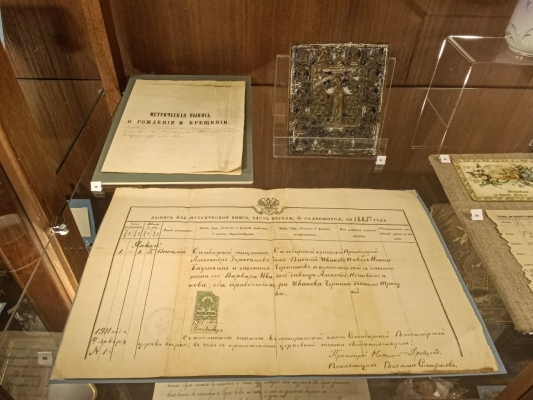 — Выставка призвана привлечь внимание к теме празднования именин и имянаречения. Некоторые из экспонатов когда-то использовались при таинстве крещения, есть в экспозиции документы, которые оформлялись при рождении ребёнка — это метрические выписки. Можно увидеть памятные подарки, которые дарили на именины, — рассказывает куратор выставки, старший научный сотрудник Музея-заповедника «Родина В. И. Ленина» Светлана Галкина.