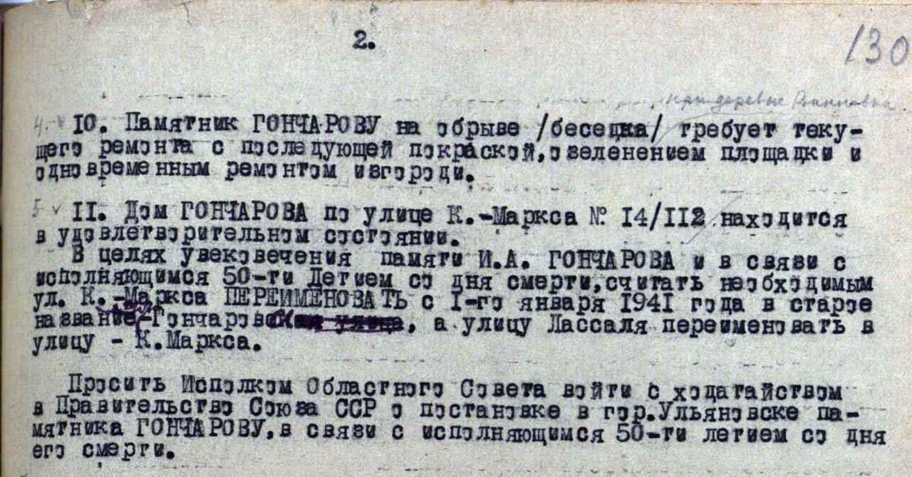 На заседании исполкома Ульяновского горсовета 6 декабря 1940 года было решено: «В целях увековечения памяти И.А. ГОНЧАРОВА и в связи с исполняющимся 50-летием со дня смерти, считать необходимым ул. К. Маркса ПЕРЕИМЕНОВАТЬ с 1-го января 1941 года в старое название – улица Гончарова, а улицу Лассаля переименовать в улицу – К. Маркса».