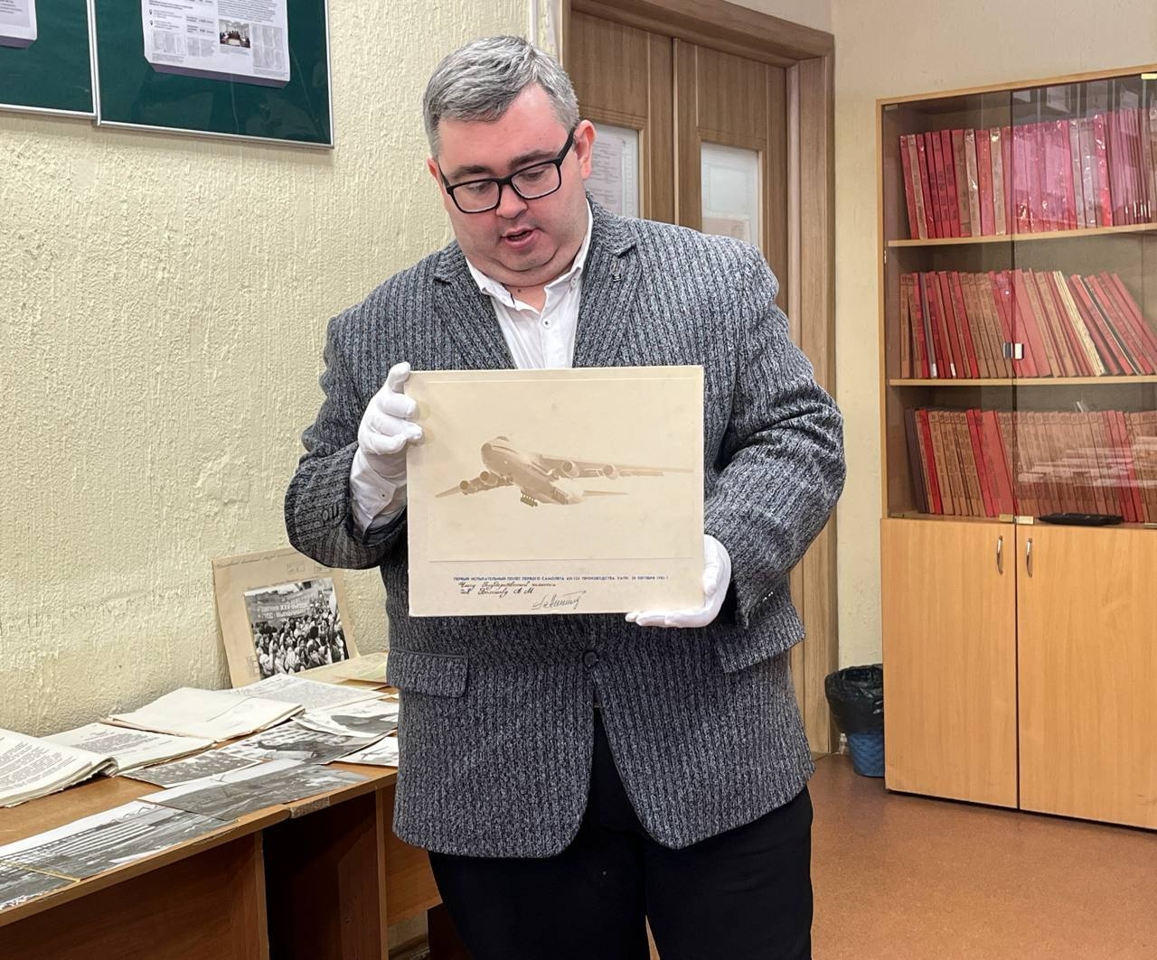Директор архива Андрей Пашкин рассказал корреспондентам региональных телеканалов и газет о начале строительства, о первом распоряжении из Москвы, с которого все начиналось. Тогда речь шла не только про авиационный завод, но и про создание целого комплекса, который включал в себя самолетостроительный, агрегатный и приборный заводы, а также полноценные жилые районы вместе со всей необходимой инфраструктурой специально для заводчан.