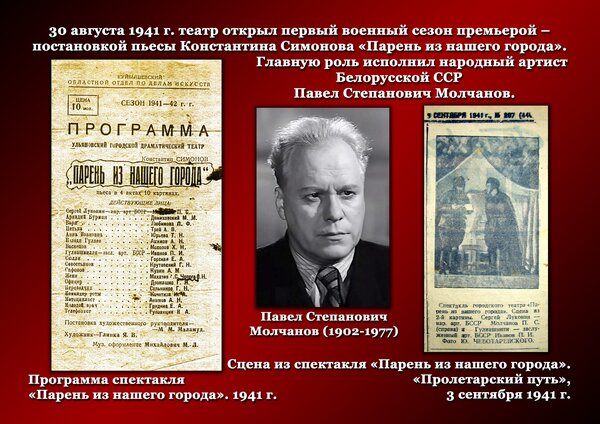 «Представляем электронную выставку, посвящённую истории Ульяновского театра драмы периода Великой Отечественной войны. Фотографии, репертуарные планы, театральные программки и афиши, материалы о кумирах прошлых лет: заслуженном артисте РСФСР Борисе Знаменском, актёре и режиссёре Анатолии Акимове, народной артистке России Лие Радиной, Василии Брагине и других мастерах сцены», - сообщили в архиве.