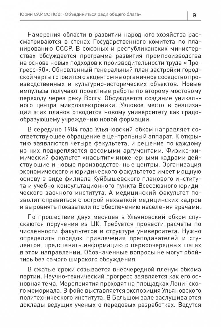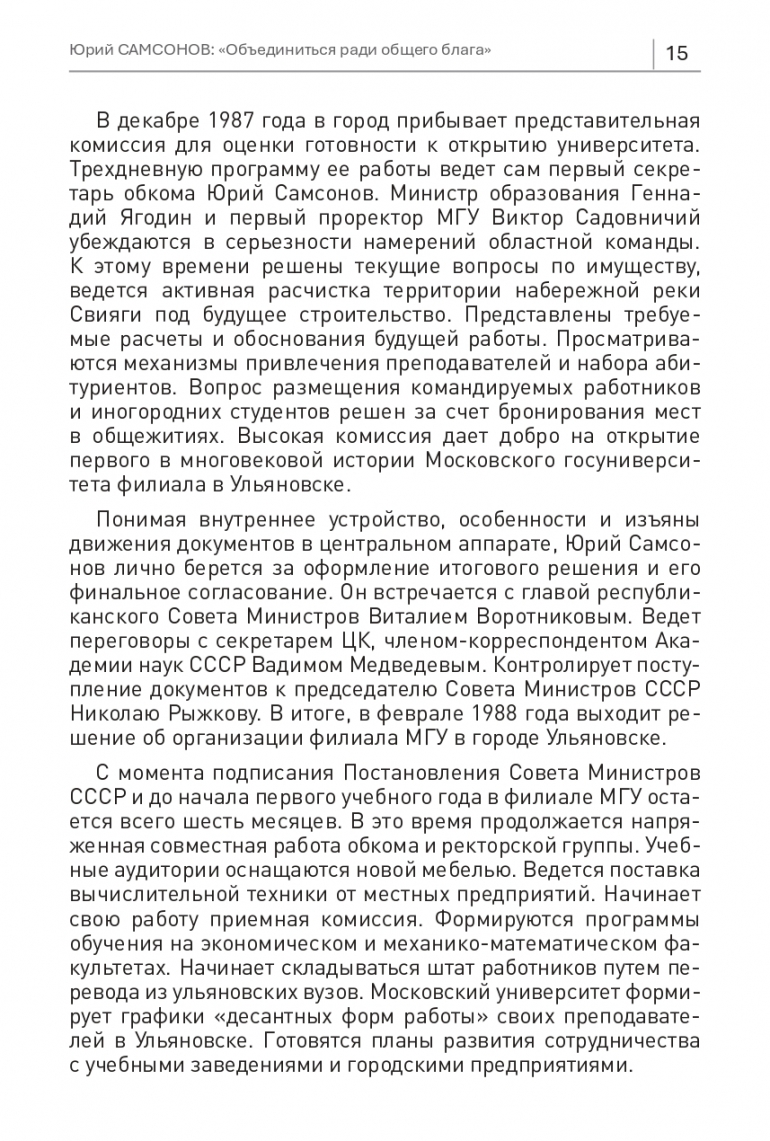 Понимая внутреннее устройство, особенности и изъяны движения документов в центральном аппарате, Юрий Самсонов лично берется за оформление итогового решения и его финальное согласование. Он встречается с главой республи-канского Совета Министров Виталием Воротниковым. Ведет переговоры с секретарем ЦК, членом-корреспондентом Академии наук СССР Вадимом Медведевым. Контролирует поступление документов к председателю Совета Министров СССР Николаю Рыжкову. В итоге, в феврале 1988 года выходит решение об организации филиала МГУ в городе Ульяновске.