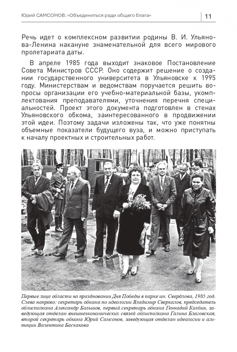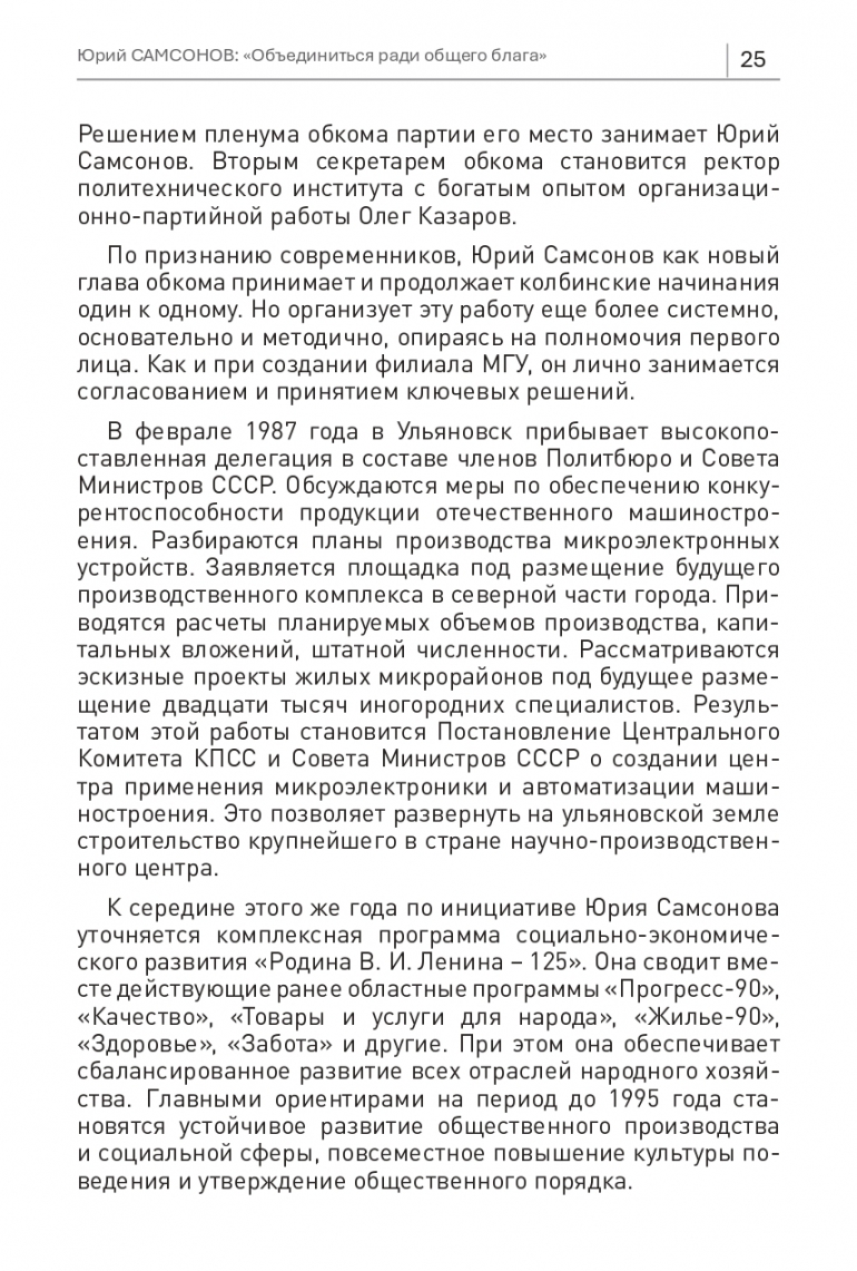 Под руководством товарища Колбина под областные программы подводится прочная идеологическая основа. Важно укрепить родину В. И. Ленина в качестве центра пропаганды идей ленинизма в преддверии знаменательной даты. Успешная реализация амбициозных планов опирается на слаженную работу первого и второго секретарей обкома. Геннадий Колбин имеет налаженные связи с первыми лицами государства, членами секретариата ЦК, министрами. Поэтому берется сам и привлекает своего заместителя к работе в высших эшелонах власти. Юрий Самсонов, в свою очередь, отвеча-ет за организацию работы хорошо знакомых ему властей на местном уровне. Он помогает им в понимании рабочих вопросов, более методичном и энергичном решении возникающих проблем.