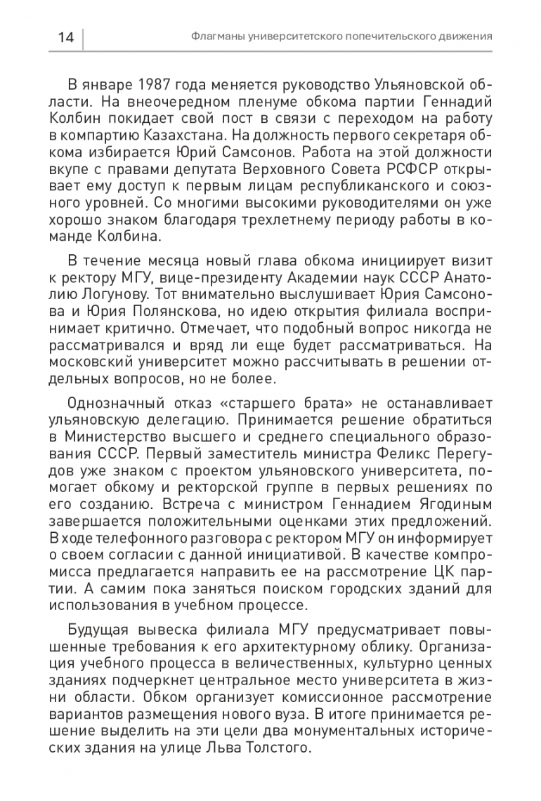 Результаты переговоров с университетами обсуждаются на рабочей группе в обкоме. Каждый из этих вузов имеет бога-тую историю, ведет подготовку по широкому набору специаль-ностей, активен в научно-технической работе, располагается в исторических зданиях. Образование филиала «под крылом» одного из них, безусловно, заложит серьезный фундамент образуемого в Ульяновске университета. В определенный момент дискуссий возникает новая идея, кажущаяся многим немыслимой и невыполнимой. Замахнуться на открытие филиала МГУ имени М. В. Ломоносова. Но главный вуз страны еще никогда в своей истории филиалов не имел, поэтому сложно рассчитывать на его безусловную поддержку. С другой стороны, такой амбициозный план задаст самую высокую планку в развитии нового учреждения. Ориентация на московский университет принимается за основное направление работы. Обком берется за продвижение этого непростого решения в высоких кабинетах власти.