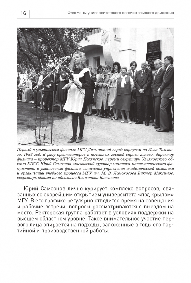 Первый в ульяновском филиале МГУ День знаний перед корпусом на Льва Толстого, 1988 год. В ряду организаторов и почетных гостей справа налево: директорфилиала – проректор МГУ Юрий Полянсков, первый секретарь Ульяновского обкома КПСС Юрий Самсонов, московский куратор механико-математического факультета в ульяновском филиале, начальник управления академической политикии организации учебного процесса МГУ им. М. В. Ломоносова Виктор Максимов, секретарь обкома по идеологии Валентина Баскакова: