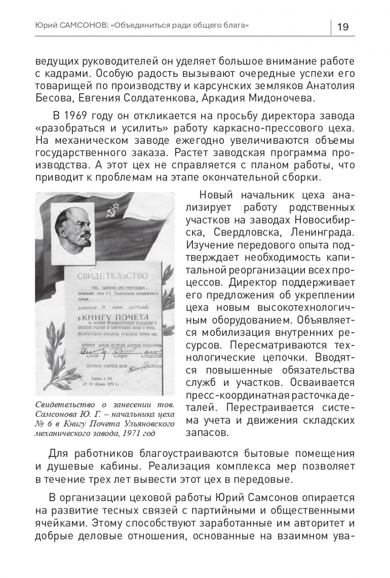 Свидетельство о занесении тов.Самсонова Ю. Г. – начальника цеха № 6 в Книгу Почета Ульяновскогомеханического завода, 1971 год: