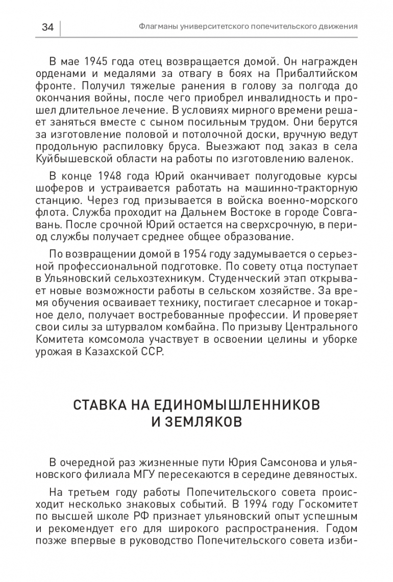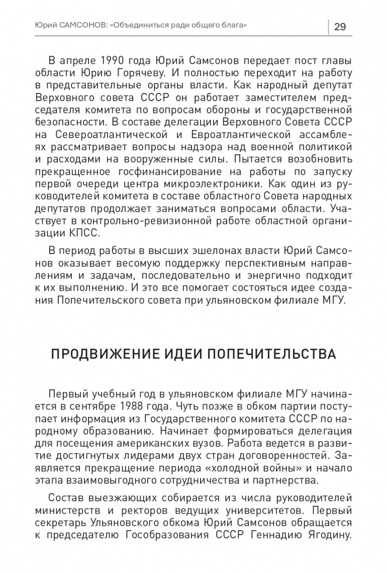 Собрание по поводу учреждения Попечительского советапроводится в январе 1992 года. Принимаются решения о его создании, утверждается устав, выбирается президиум, запускаются процессы регистрации юридического лица и формирования бюджета. В состав двадцати шести учредителей входит Юрий Самсонов как народный депутат Ульяновского областного Совета, член постоянной комиссии по строительству. Один из отцов-основателей филиала МГУ является ключевой фигурой в организации попечительского движения. Его мотивы связаны с переживаниями за судьбу нового российского образования на фоне повсеместного отказа от «пережитков» советского прошлого. Того самого времени, когда все были равны и работали на один котел, на одну задачу.