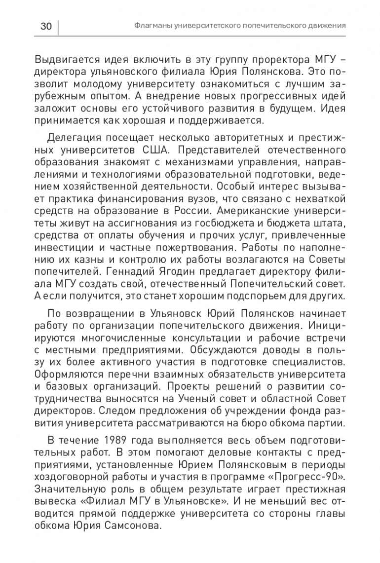 По возвращении в Ульяновск Юрий Полянсков начинает работу по организации попечительского движения. Инициируются многочисленные консультации и рабочие встречи с местными предприятиями. Обсуждаются доводы в пользу их более активного участия в подготовке специалистов. Оформляются перечни взаимных обязательств университетаи базовых организаций. Проекты решений о развитии сотрудничества выносятся на Ученый совет и областной Совет директоров. Следом предложения об учреждении фонда развития университета рассматриваются на бюро обкома партии.