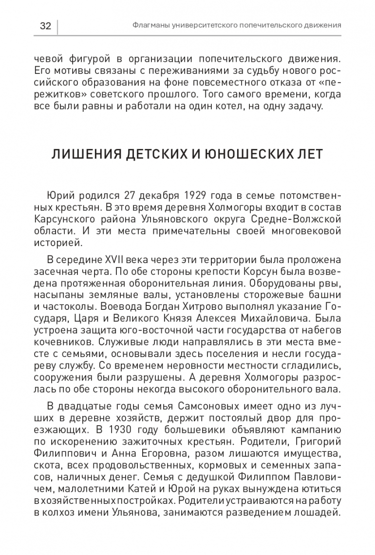 В двадцатые годы семья Самсоновых имеет одно из луч-ших в деревне хозяйств, держит постоялый двор для про-езжающих. В 1930 году большевики объявляют кампаниюпо искоренению зажиточных крестьян. Родители, ГригорийФилиппович и Анна Егоровна, разом лишаются имущества,скота, всех продовольственных, кормовых и семенных запасов, наличных денег. Семья с дедушкой Филиппом Павлови-чем, малолетними Катей и Юрой на руках вынуждена ютитьсяв хозяйственных постройках. Родители устраиваются на работув колхоз имени Ульянова, занимаются разведением лошадей.