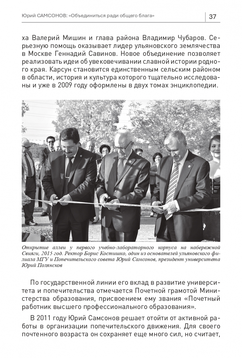 Открытие аллеи у первого учебно-лабораторного корпуса на набережнойСвияги, 2015 год. Ректор Борис Костишко, один из основателей ульяновского филиала МГУ и Попечительского совета Юрий Самсонов, президент университета Юрий Полянсков: