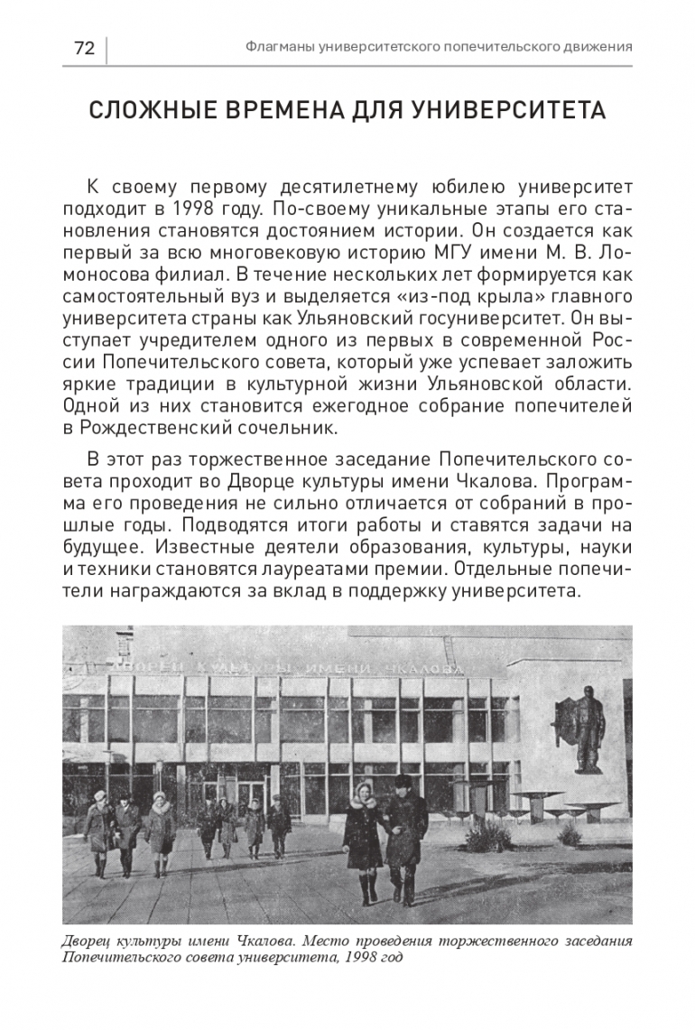 К своему первому десятилетнему юбилею университет подходит в 1998 году. По-своему уникальные этапы его становления становятся достоянием истории. Он создается как первый за всю многовековую историю МГУ имени М. В. Ломоносова филиал. В течение нескольких лет формируется как самостоятельный вуз и выделяется «из-под крыла» главного университета страны как Ульяновский госуниверситет. Он выступает учредителем одного из первых в современной России Попечительского совета, который уже успевает заложить яркие традиции в культурной жизни Ульяновской области. Одной из них становится ежегодное собрание попечителей в Рождественский сочельник. В этот раз торжественное заседание Попечительского совета проходит во Дворце культуры имени Чкалова. Программа его проведения не сильно отличается от собраний в прошлые годы. Подводятся итоги работы и ставятся задачи на будущее. Известные деятели образования, культуры, науки и техники становятся лауреатами премии. Отдельные попечители награждаются за вклад в поддержку университета.