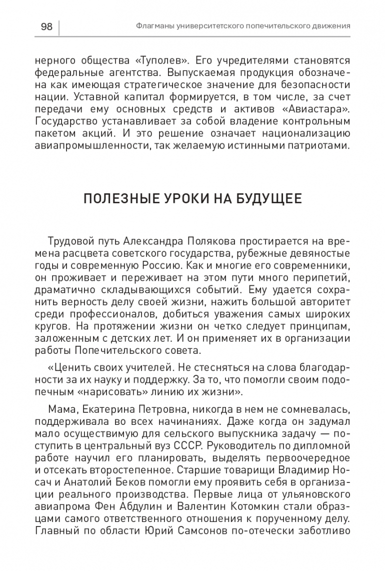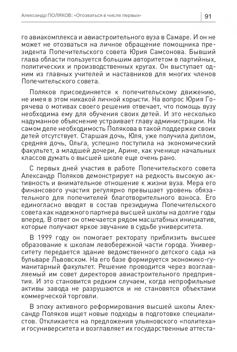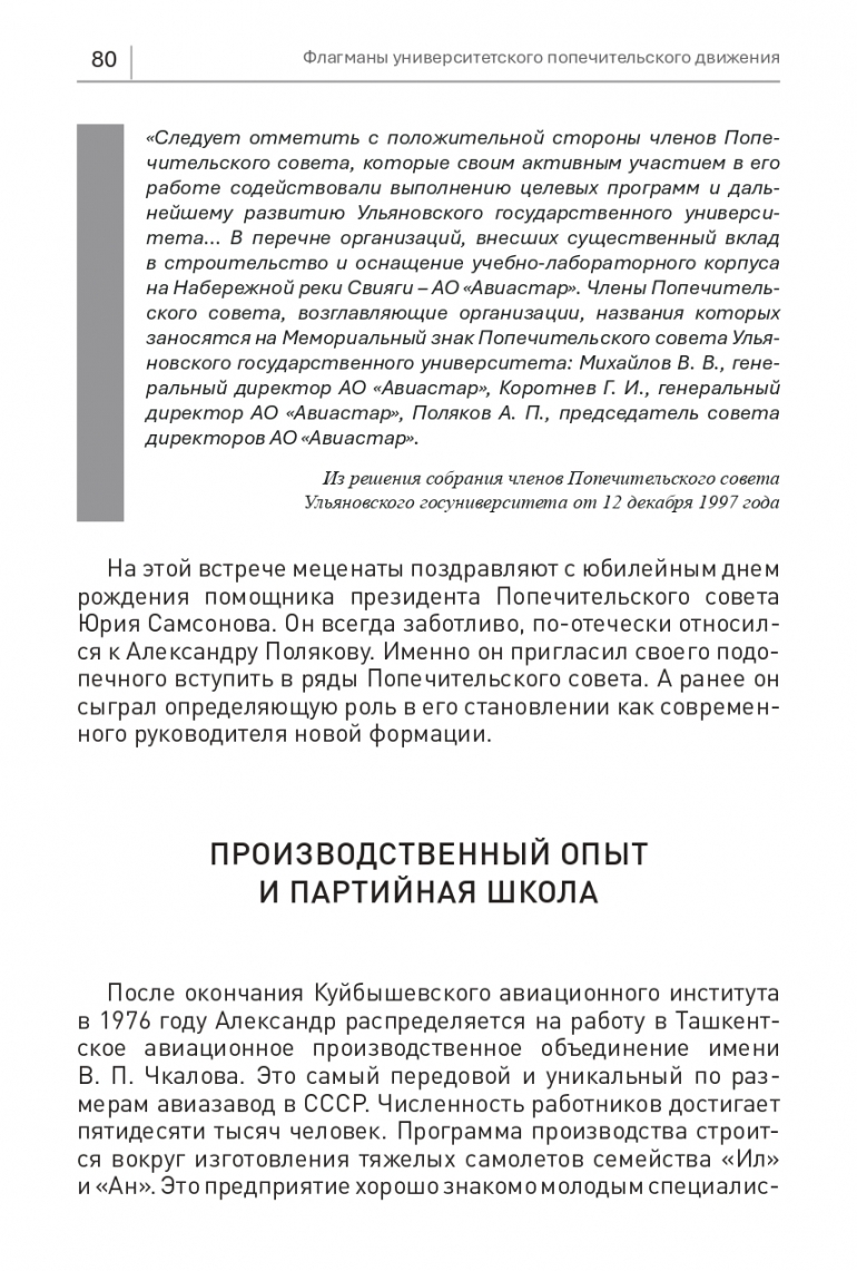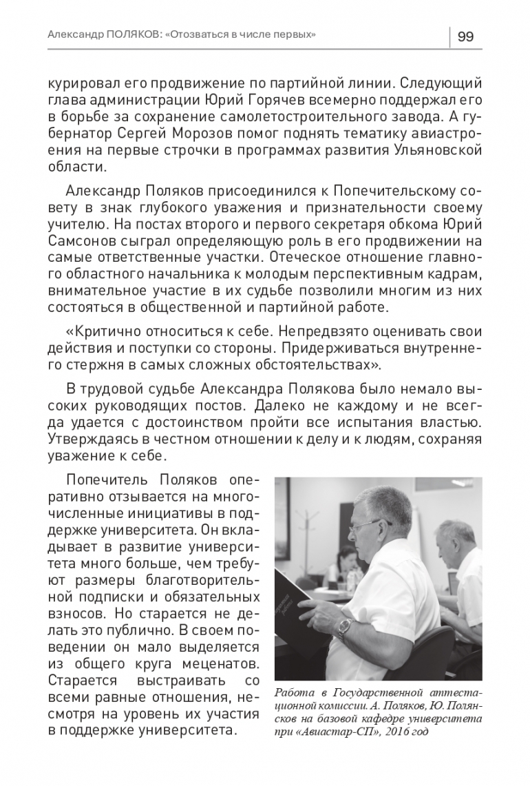 УлГУ презентовал книгу «Флагманы университетского попечительского движения». Ее автор первый ректор, а ныне президент вуза Юрий Полянсков. Издание вышло ограниченным тиражом и, чтобы как можно больше людей могли прочитать книгу, эксклюзивно на 73online.ru будут опубликованы все главы первого тома. Сегодняшняя посвящена экс-председателю совета директоров ЗАО «Авиастар-СП» Александру Полякову.