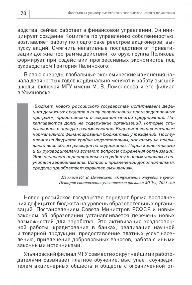«Бюджет нового российского государства испытывает дефицит денежных средств в силу сворачивания производственных программ, приостановки и закрытия многий предприятий. Накапливаются долги на содержание организаций, которые списываются в порядке взаимозачетов. Видоизменяется механизм нормативного финансирования бюджетных учреждений. Поступления из бюджета крайне недостаточны, поскольку не покрывают весь объем расходов на содержание. Перед коллективами и их руководителями встают вопросы сохранения организаций. Это означает перестроиться на работу в новых условиях и научиться зарабатывать. Вопрос о привлечении дополнительных средств приобретает характер выживания». Из книги Ю. В. Полянскова «Стремление опередить время. История становления ульяновского филиала МГУ», 2023 год
