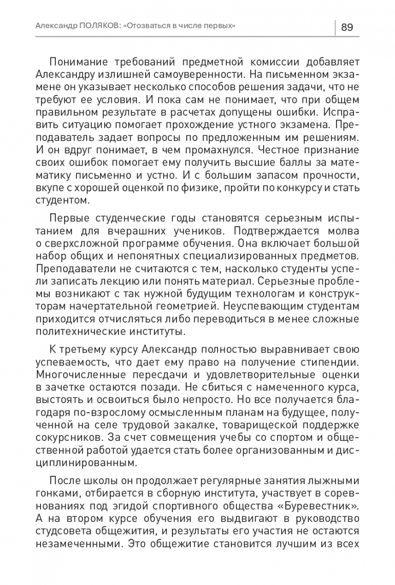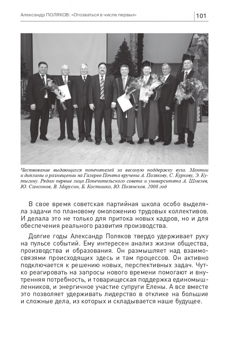 Долгие годы Александр Поляков твердо удерживает руку на пульсе событий. Ему интересен анализ жизни общества, производства и образования. Он размышляет над взаимосвязями происходящих здесь и там процессов. Он активно подключается к решению новых, перспективных задач. Чутко реагировать на запросы нового времени помогают и внутренняя потребность, и товарищеская поддержка единомышленников, и энергичное участие супруги Елены. А все вместе это позволяет удерживать лидерство в отклике на большие и сложные дела, из которых и складывается наше будущее.
