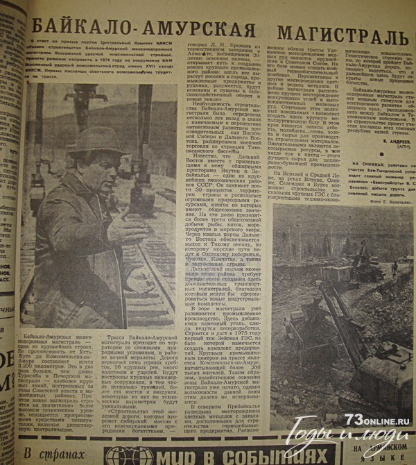 В ответ на призыв партии Центральный Комитет ВЛКСМ объявляет строительство Байкало-Амурской железнодорожной магистрали Всесоюзной ударной комсомольской стройкой. Принято решение направить в 1974 году на сооружение БАМ Всесоюзный ударный комсомольский отряд имени XVII съезда ВЛКСМ. Первые посланцы советского комсомола уже трудятся на трассе.