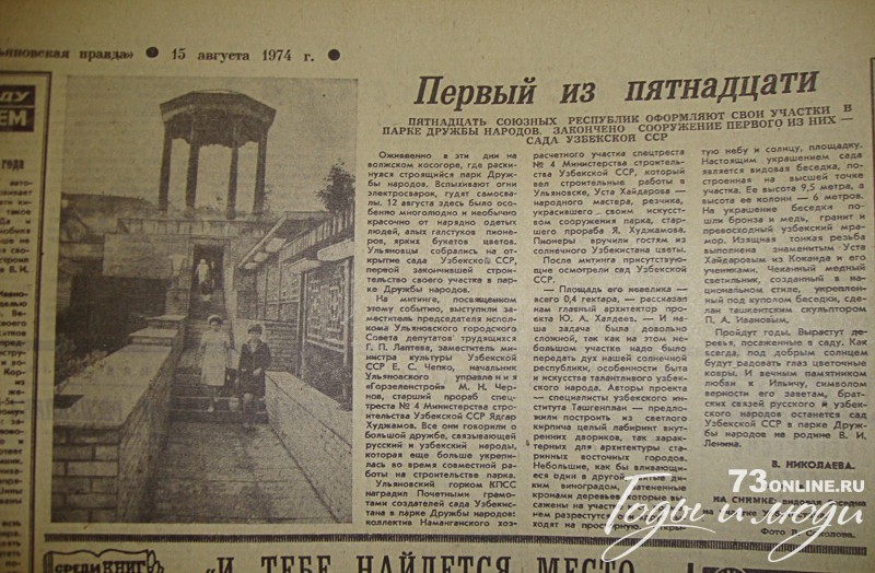 На митинге, посвященном этому событию, выступили заместитель председателя исполкома Ульяновского городского Совета депутатов трудящихся Г.П. Лаптева, заместитель министра культуры Узбекской ССР Е.С. Чепко, начальник Ульяновского управления «Горзеленстрой» М.Н. Чернов, старший прораб спецтреста № 4 Министерства строительства Узбекской ССР Ядгар Худжамов. Все они говорили о большой дружбе, связывающей русский и узбекский народы, которая еще больше укрепилась во время совместной работы на строительстве парка (...)