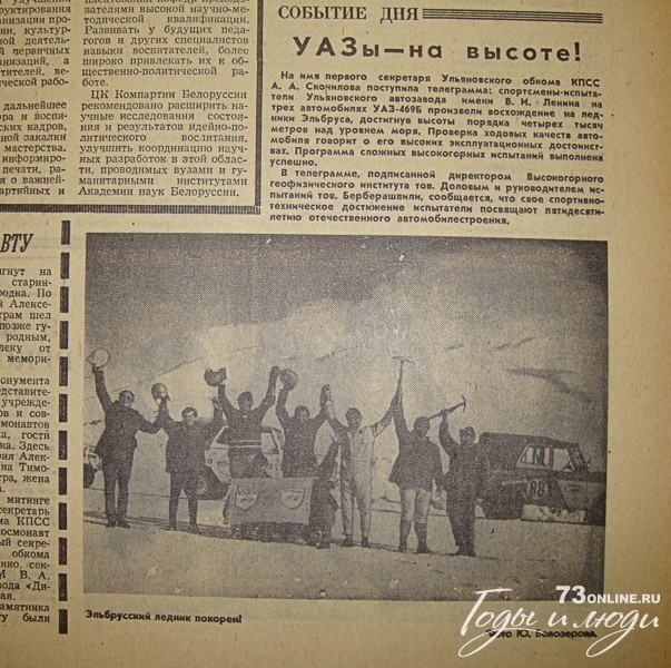 На имя первого секретаря Ульяновского обкома КПСС А.А. Скочилова поступила телеграмма: спортсмены-испытатели Ульяновского автозавода на автомобилях УАЗ-469Б произвели восхождение на ледники Эльбруса, достигнув высоты порядка четырех тысяч метров над уровнем моря (...) Программа сложных высокогорных испытаний выполнена успешно (...)