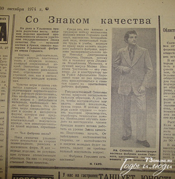 На днях в Ульяновск пришла радостная весть: впервые изделия швейной промышленности области удостоены государственного Знака качества. Это – мужской костюм и брюки, сшитые мастерами Ульяновской фабрики имени Горького.
