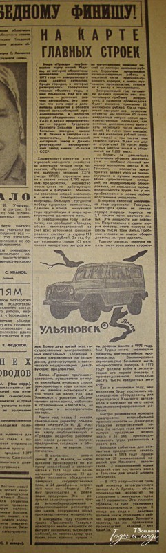 Среди городов. в которых развернулось сооружение главных объектов года, и наш Ульяновск. Над его названием – условный значок: автомобиль. Это значит, что речь идет о дальнейшем развитии в области нашей автомобильной промышленности, в которую входят объединение «АвтоУАЗ» с двумя предприятиями – ордена Трудового Красного Знамени автомобильным заводом имени В.И. Ленина и заводом «Автозапчасть», Ульяновский моторный завод и Димитровградский автоагрегатный завод имени 50-летия СССР (...)