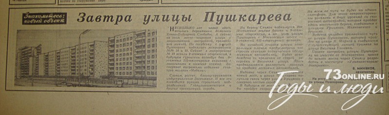 Несколько лет назад здесь ютились деревянные домишки Конно-Подгорной Слободы. А сейчас на этом месте – широкая улица с многоэтажной застройкой, трамвайной линией. По соседству с улицей Пушкарева поднялись микрорайоны №№ 18 и 19. Сейчас в микрорайоне № 19 встали 9-этажные общежития, в будущем строители возведут два 9-этажных 215-квартирных великана с магазинами в нижних этажах. Засверкает витражами отдельно стоящий магазин «Мебель».