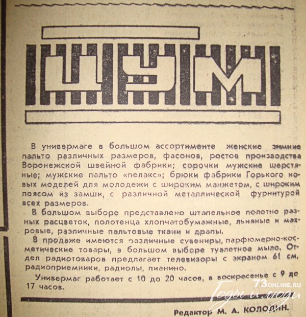В универмаге в большом ассортименте женские зимние пальто различных размеров, фасонов, ростов производства Воронежской швейной фабрики; сорочки мужские шерстяные; мужские пальто «пелакс»; брюки фабрики Горького новых моделей для молодежи с широким манжетом, с широким поясом из замши, с различной металлической фурнитурой всех размеров.