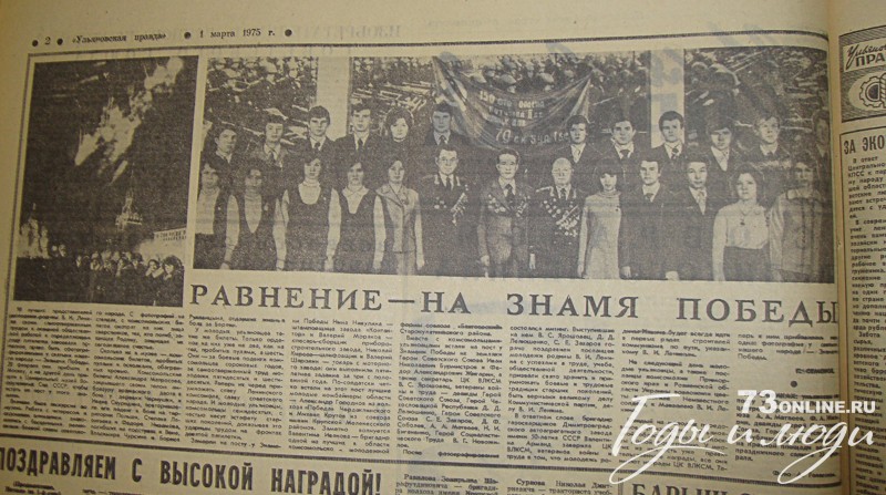 (...) Замерли на посту у Знамени Победы Нина Никулина – штамповщица завода «Контактор» и Валерий Моряков – слесарь-сборщик приборостроительного завода, Николай Киреев – шлифовщик и Валерий Шарохин – токарь с моторного завода: они выполнили пятилетнее задание за три с половиной года. По-солдатски четко встали на этот пост лучшие молодые комбайнеры области – Александр Городнов из колхоза «Победа» Чердаклинского и Михаил Крутов из совхоза имени Крупской Мелекесского районов. Заметно волнуется Валентина Иванова – бригадир одной из лучших в области комсомольско-молодежной фермы совхоза «Бахтеевский» Старокулаткинского района.