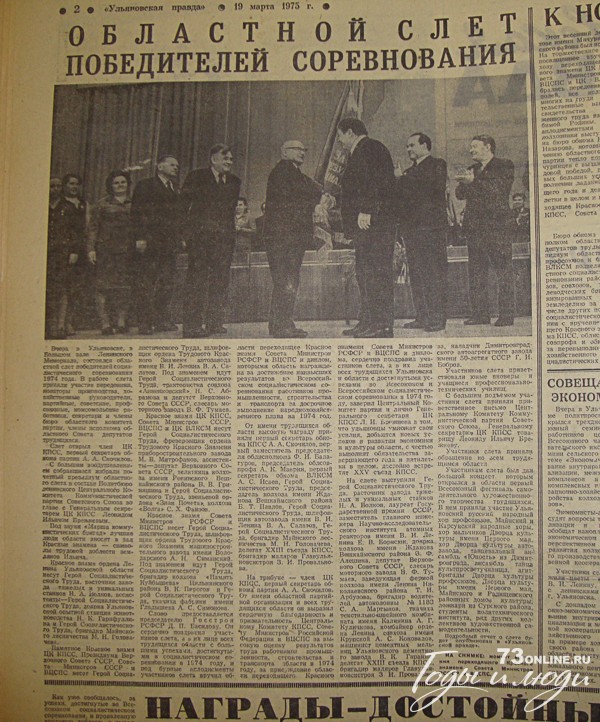 18 марта 1975 года в Большом зале Ленинского Мемориала состоялся областной слет победителей социалистического соревнования 1974 года.