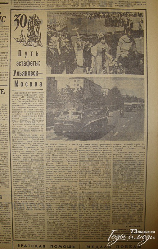 Переданная по телетайпам тассовская информация сообщала: «В четвертый день мая в Ленинград, Минск, Киев, Ростов-на-Дону и Ульяновск прибыли участники Всесоюзной комбинированной звездной эстафеты, стартовавшей из всех союзных республик и городов-героев. Эстафета проводится ВЦСАС, Комитетом по физической культуре и спорту при Совете Министров СССР, ЦК ДОСААФ СССР, Советским комитетом ветеранов войны и посвящена 30-летию Победы советского народа в Великой Отечественной войне».