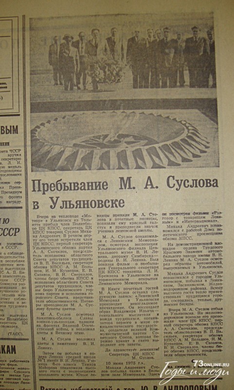 Вчера на теплоходе «Метеор» в Ульяновск из Тольятти прибыл член Политбюро ЦК КПСС, секретарь ЦК КПСС товарищ Суслов Михаил Андреевич. В речном порту его тепло встретили член ЦК КПСС, первый секретарь Ульяновского обкома партии А.А. Скочилов, председатель исполкома областного Совета депутатов трудящихся В.П. Васильев, секретари обкома КПСС А.М. Большов, И.М. Кузнецов, В.Н. Сверкалов (...)