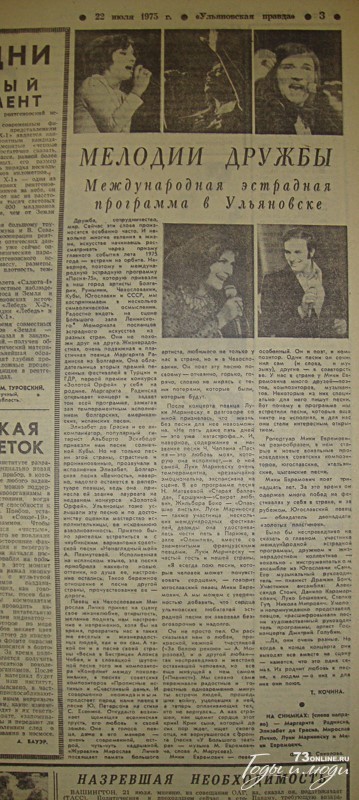 Дружба, сотрудничество, мир. Сейчас эти слова произносятся особенно часто. И невольно многие явления в жизни, искусстве начинаешь рассматривать через призму главного события лета 1975 года – встречи на орбите. Наверное, поэтому и международную эстрадную программу «Песня-75», которую привезли в наш город артисты Болгарии, Румынии, Чехословакии,Ж Кубы, Югославии и СССР, мы воспринимаем в несколько символическом осмыслении. Радостно видеть на сцене Большого зала Ленинского Мемориала посланцев эстрадного искусства из разных стран. Они не похожи друг на друга (...)