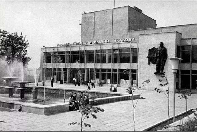 Перед клубом – обширная площадка, выложенная бетонными плитами, с брызгальным бассейном в центре (...) В светлой штукатурке решены и фасады здания. Колонны облицованы мрамором, витрины – алюминиевые. У входа посетителей клуба встречает фигура прославленного пилота, чьим именем назван клуб. Это чеканный медный горельеф на широком пилоне. Валерий Павлович изображен стоящим в спокойной позе, со штурманской сумкой в руке, на фоне маршрута легендарного перелета через Северный полюс. Это работа ульяновского скульптора А.И. Клюева.