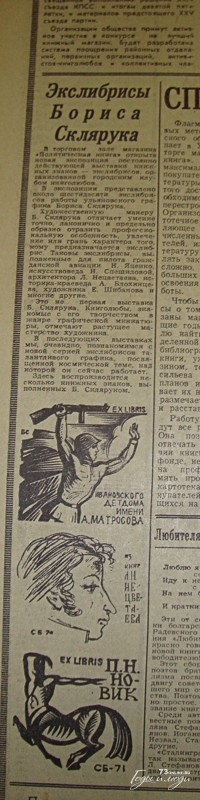 В последующих выставках мы, очевидно, познакомимся с новой серией экслибрисов талантливого графика, посвященной космической теме, над которой он сейчас работает (...)