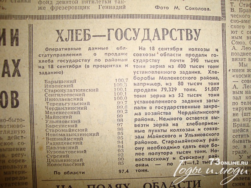 (...) На 18 сентября колхозы и совхозы области продали государству почти 390 тысяч тонн зерна из 400 тысяч тонн установленного задания (...)