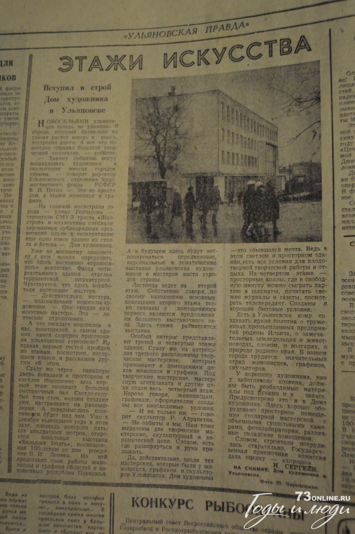 - Такому событию могут позавидовать художники и скульпторы многих городов страны, - говорит директор Ульяновского отделения Художественного фонда РСФСР В.И. Петин. - Это не просто дом, а этажи живописи и графики (...)