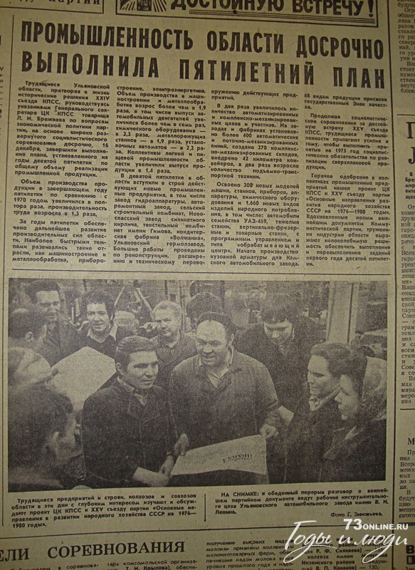 (...) В девятой пятилетке в области вступили в строй действующих новые промышленные предприятия, в том числе завод гидроаппаратуры, авторемонтный завод, сельский строительный комбинат, Новоспасский завод силикатного кирпича, текстильной комбинат имени Гимова, кондитерская фабрика «Волжанка», Ульяновский гормолзавод (...) Освоено 300 новых моделей машин, станков, приборов, аппаратуры и 1.660 новых видов изделий народного потребления (...)